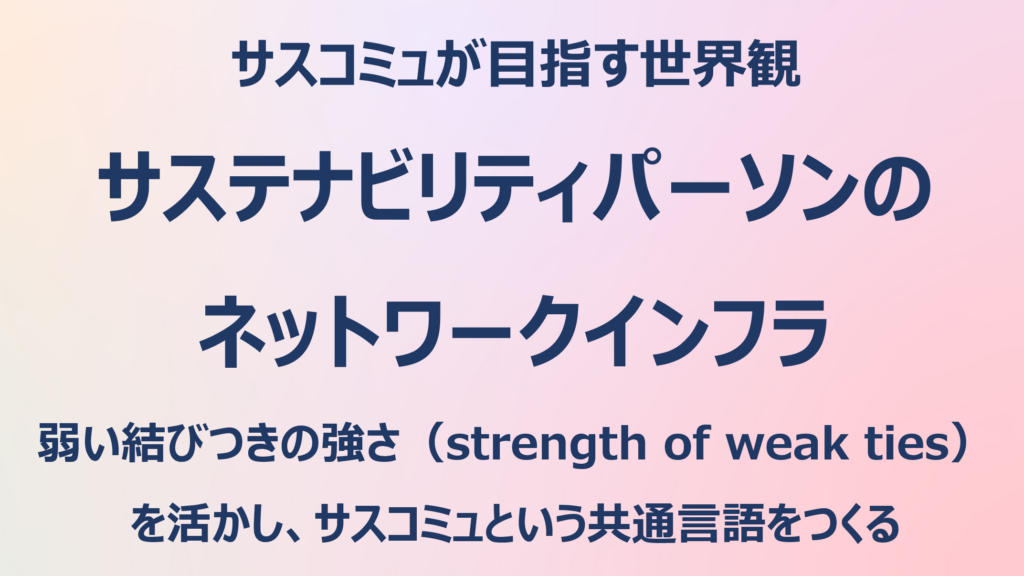 サステナビリティに関する様々なテーマについて情報を交換し合い、学び合う活動を通して、サステナビリティに携わるコミュニティメンバーの相互学習とエンパワーメントを達成し、Build Forward Better(より良い前進)の実現に貢献します。